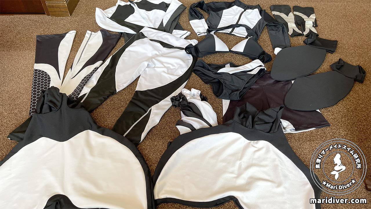 これ実はみーんな、シャチのマーメイドスイム衣装です。レギンス、ラッシュガード、ショートパンツ、ビキニ、腕飾り、胸ビレ、ロングソックス──