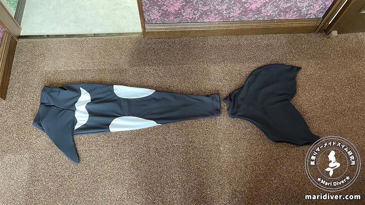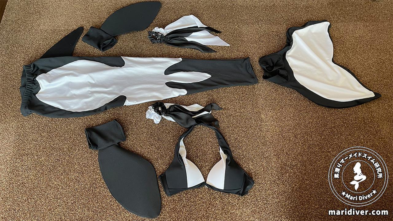 今回の動画で使用したシャチ衣装はこれです。ビキニトップスも黒と白。胸ビレは腕につける形にしました。中にネオプレンの芯が入っているのでシャチのヒレのように水になびきます。背びれもあるんですよ。