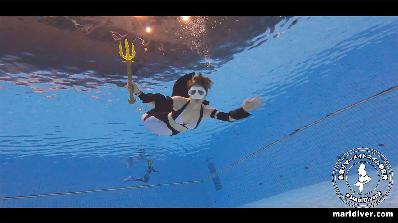 私が手に持っているのはギリシャ神話の海の神ポセイドン、息子のトリトンの武器であるトライデント(三叉槍)。実はこれシュノーケルなんですよ。シャチは海の王と言われます。トライデントマーメイドにふさわしい小道具ではないでしょうか。いずれ制作法の動画・記事を作りたいと思います。